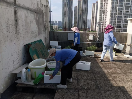 8月17日,我校出现一例输入性基孔肯雅热病例,校园环境服务中心立即启动应急预案,在市、区疾控中心的指导下,紧急在疫点核心区(100米)及外围200米范围内持续进行灭蚊消杀,在全校范围内开展常规病媒生物防制消杀,同时,组织师生员工开展全校性的爱国卫生运动,清理各个卫生死角、翻盆倒罐清理积水,突击整治校园环境卫生,减少蚊虫滋生地,坚决遏制基孔肯雅热病蔓延。其中校园环境服务中心组织博世科物业在轻工学院周边、北校园学生公寓35栋周边、机械学院、生科院、校办、南大门、南侧门、办公楼、东体育馆、汇学堂、劝学岛蓄水池等公共区域,西校园北区、中区、东校园中区、西区、东区等教职工住宅区公共区域进行环境卫生整治、积水清理、翻盘倒罐等工作。自8月17日至8月底,共出动人员合计400余人次,在教学办公区翻盆倒罐、清理罐子173处,清扫积水约147处,清理教职工住宅区排水沟、整治楼顶积水、翻盆倒罐245处,整改乱堆乱放杂物65处,教学办公区和住宅区清理杂物垃圾共计约17吨。清理北校园动科学院教学科研基地围墙内绿化树木修剪及陈年白色垃圾等工作约42吨,清理北校园学生公寓35栋陈年建筑垃圾56吨,清理农学院灌溉水葫芦约6000平方米,从16个湖泊控鱼捕捞出来的鱼类投放至鲁班湖、动物医院旁湖泊、35栋学生公寓旁池塘,累积投放约72斤。