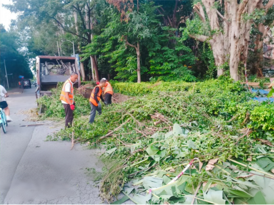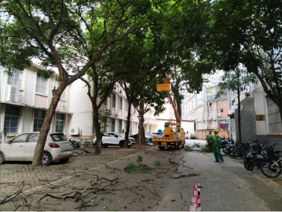树木修剪:机械学院、化工学院、工商管理学院、君武路、西水塔、西体育馆、学生公寓1栋、学生公寓10栋、三教、数信学院、育才广场、艺术学院、东校园西区13栋、东校园东区53栋、东校园中区28栋、生科院小树林、北校园教学楼、学生公寓1-1B栋、六教、蝶山路、东高5栋、农场路等区域进行枯枝处理、树木倒伏处理、雨后断枝处理、对低枝、侧枝、寄生树和靠近电线、建筑物、路灯及摄像头等设施的树枝进行修剪。