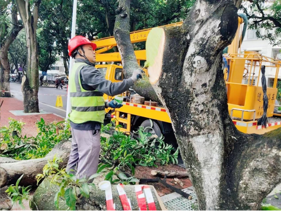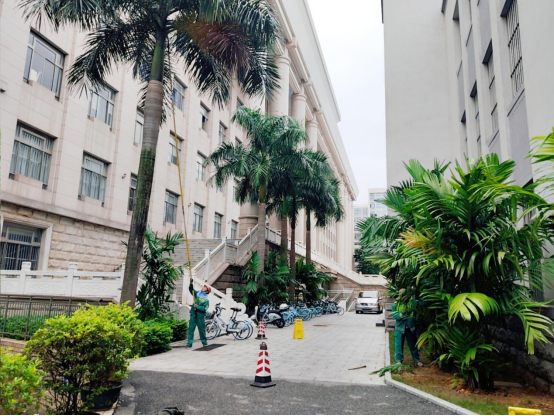 树木修剪:西校园学生公寓6B栋、育才广场、工管学院、南大门、西校园中区18栋、化工学院、西校园北区36栋、君武路、西水塔、荷湖、西体育馆、学生公寓10栋、三教、语言中心、东校园西区13栋、东校园东区27栋、东校园中区1~19栋、六教、北校园围墙、新东园、蝶山路、东高5栋、农场路等区域进行枯枝处理、树木倒伏处理、雨后断枝处理、对低枝、侧枝、寄生树和靠近电线、建筑物、路灯及摄像头等设施的树枝进行修剪。