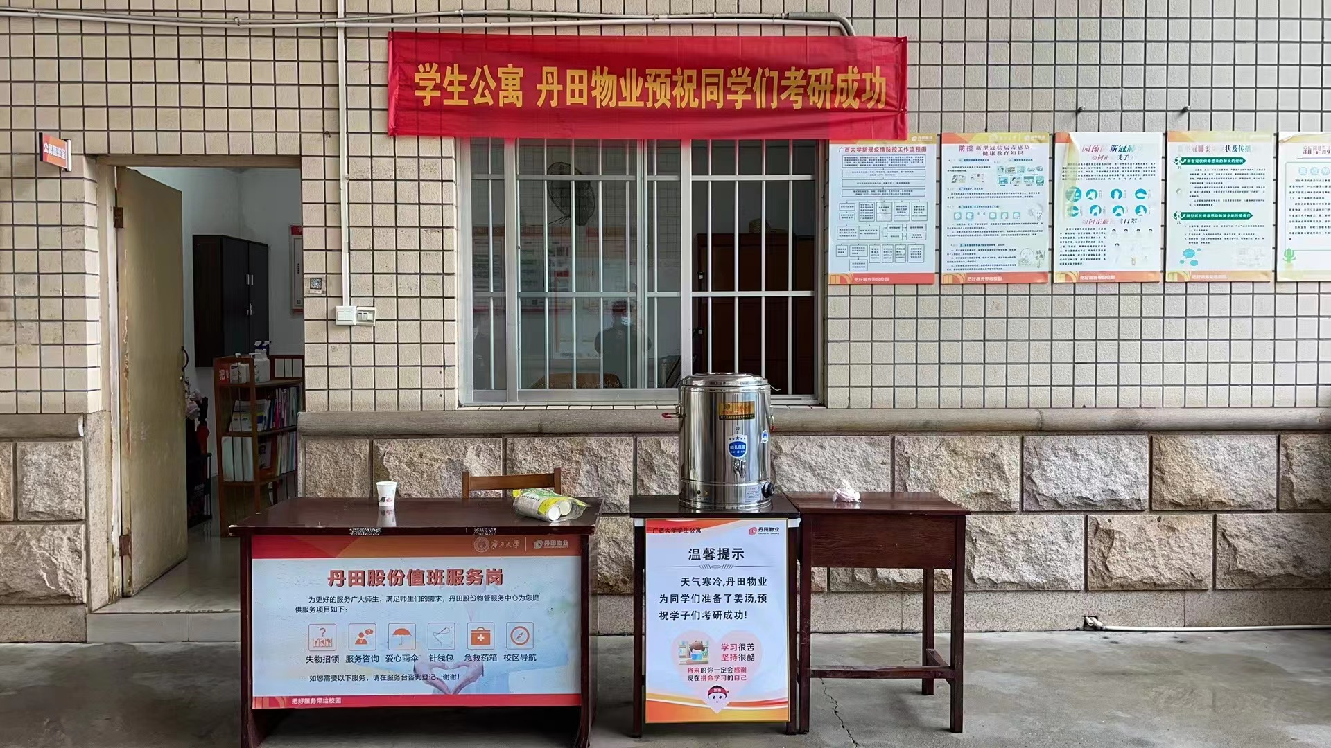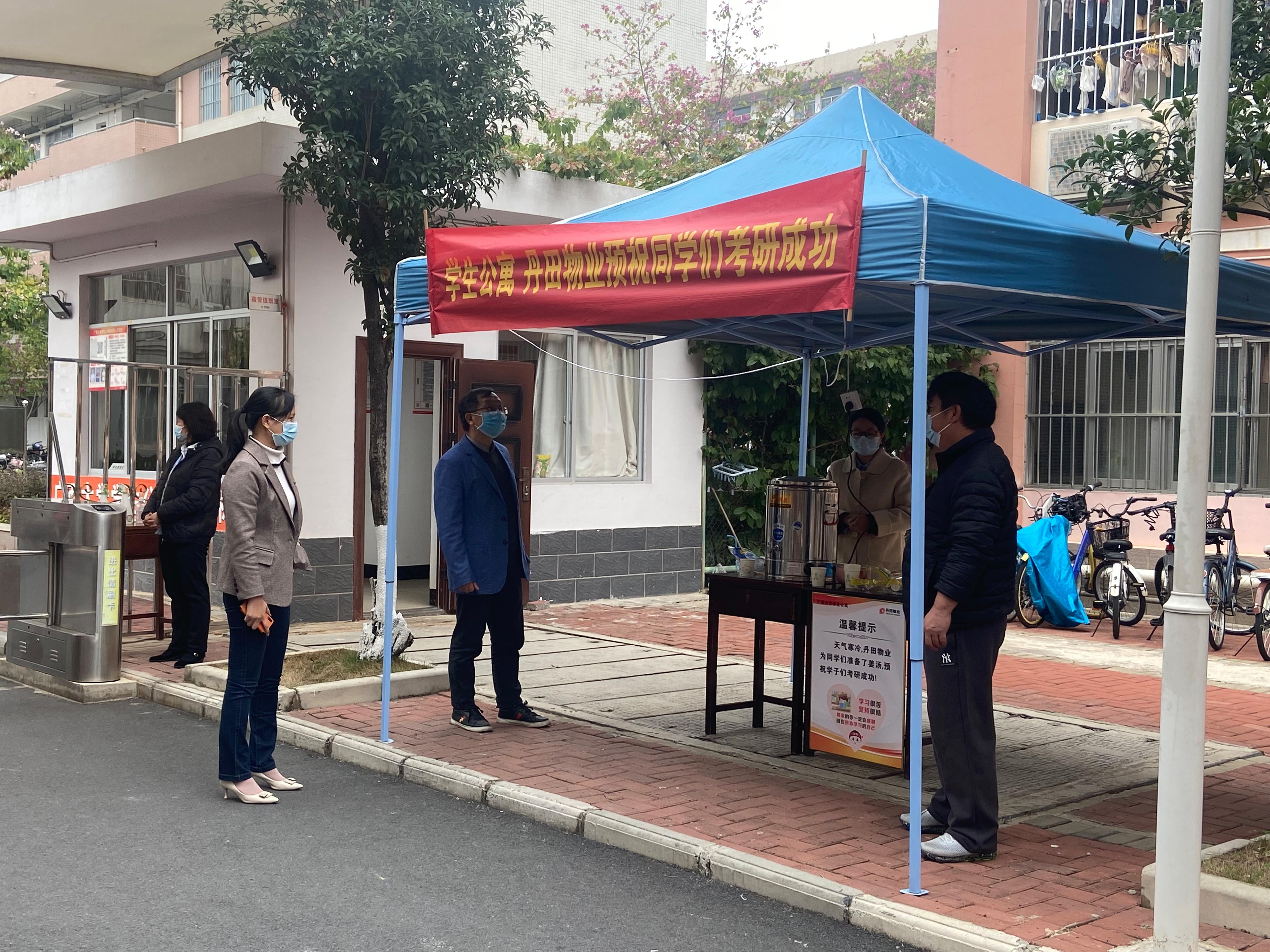 目前正值学生考研冲刺期,后勤基建处联合学生公寓物业开展“温馨家园——我为考研学生送温暖”活动。在西1-5栋园区、西7-15栋园区、东3栋、2B、18园区、东13-15栋园区、东19-21栋园区、东27栋等相关区域设置专门的考研服务点,每天为同学们提供免费的姜汤糖水,还以多种形式的宣传海报为考研的同学们加油鼓劲。贴心的服务与关怀让考研的同学们在寒冷的冬天感受特别的温暖。