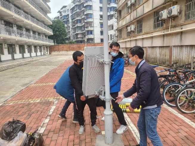 为保障住在学生宿舍健康观察区的学生能正常使用手机上网课,后勤管理处市场服务监管岗联合广西移动南宁西区分公司,安排技术人员对健康观察区进行信号测试,安装临时应急通信基站,使网络信号得到了有效改善。