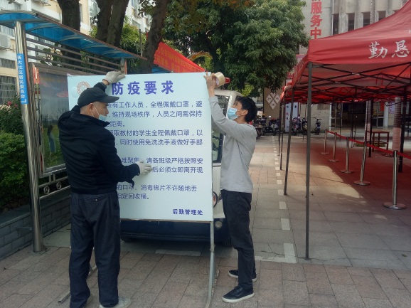 为保障教材发放工作有序进行,后勤管理处教学服务管理岗联合新大正物业按疫情防控要求对教材发放区进行布置,设置1米线,并做好区域的消毒消杀工作。