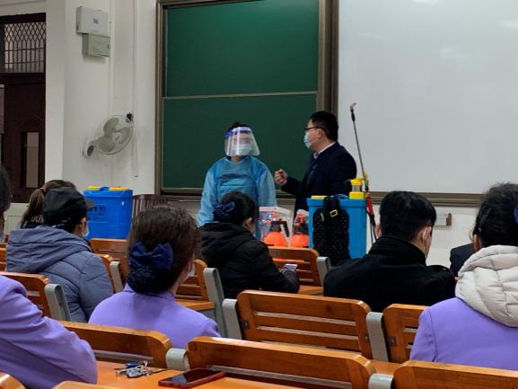后勤管理处长袁新胜、副处长郭昌明、学生公寓和丹田物业工作人员以及学生共30余人,在学生公寓西16栋园区开展开学疫情防控应急预案演练,确保每一位值班员和消杀人员都能熟练处理疫情突发事件。