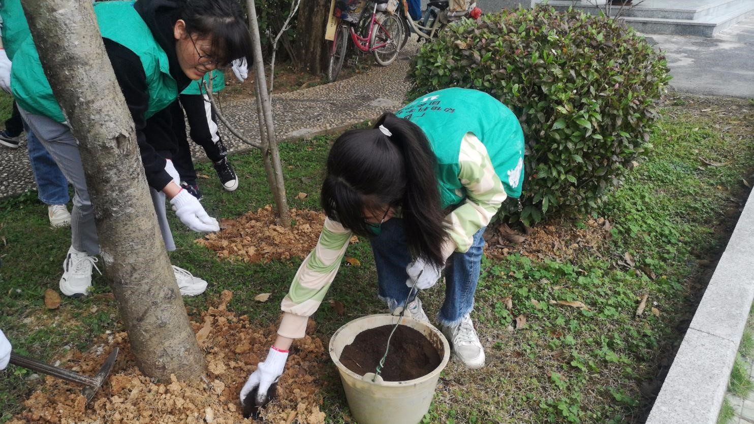 此次活动主要是由博世科的绿化工作人员进行讲解指导学生绿植种植和养护的知识。植树现场一派热火朝天的景象,同学们分工协作、相互配合,大家对树木进行除杂、松土施肥、铲土培实,配合默契,大家个个干劲十足,不畏辛苦,共进行松土施肥梨花25颗,桃树15颗,以极大的热情圆满完成任务。