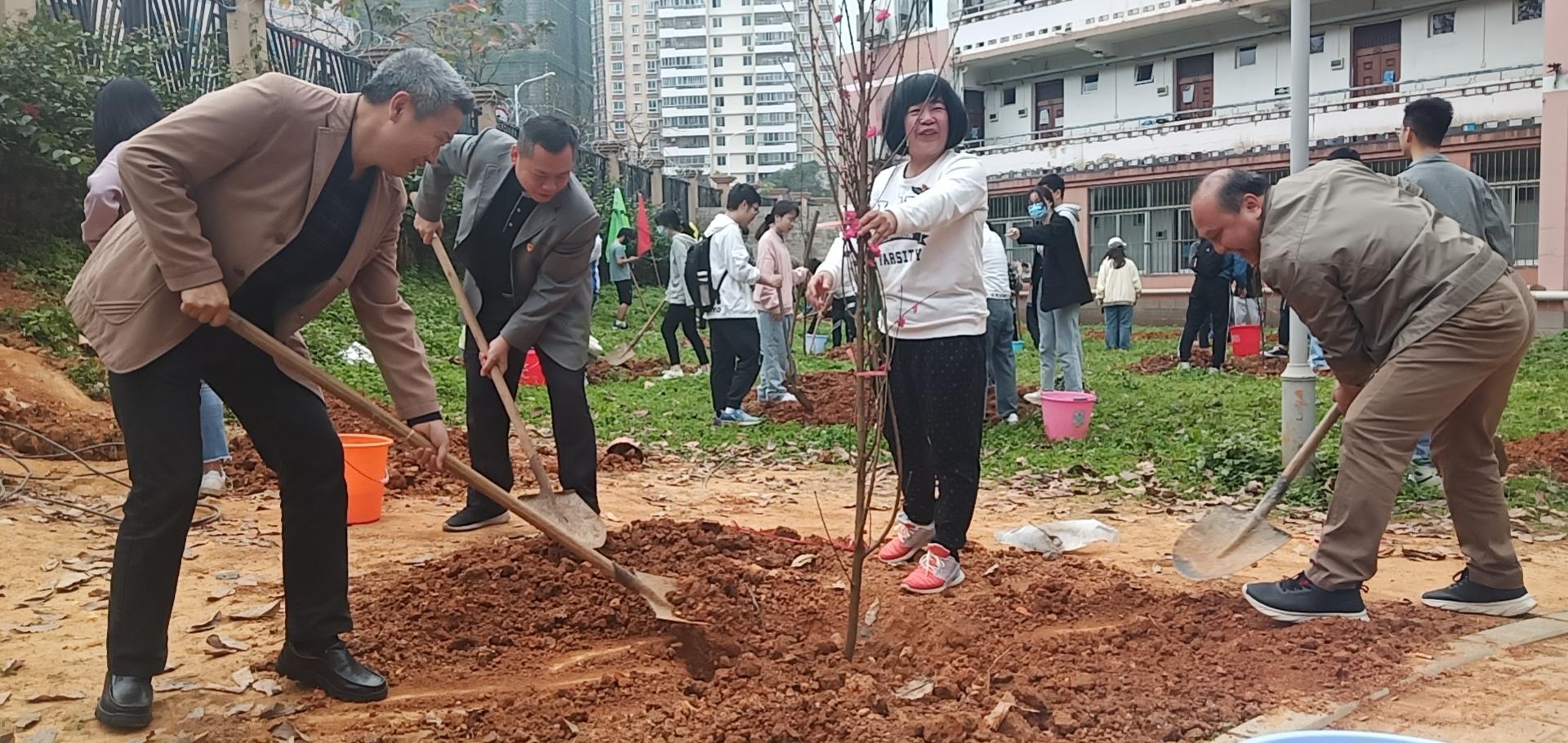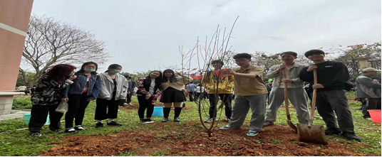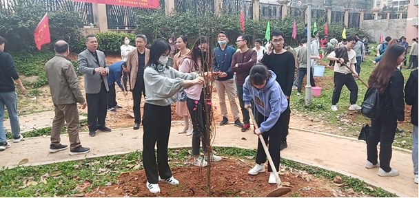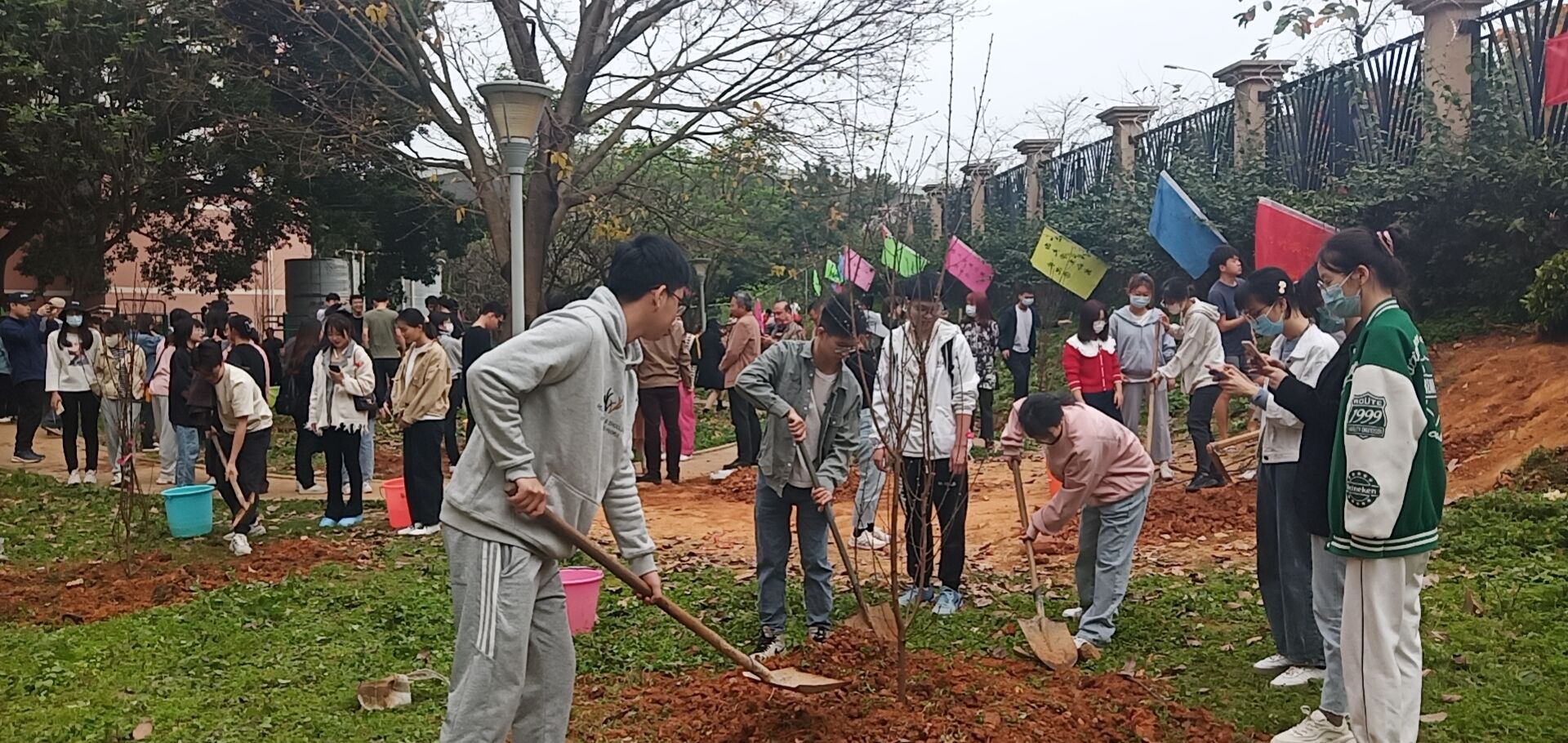 在植树活动现场,后勤老师们和同学们热情高涨,熙熙攘攘,平时锄头都很少使用的同学们,此刻却有板有眼地当起了园艺师,分工协作,有的挖坑、有的扶树苗、有的浇水......场面温馨且快乐。很快,在老师和同学们的辛勤劳动下,桃树苗便“亭亭玉立”在沃土上。