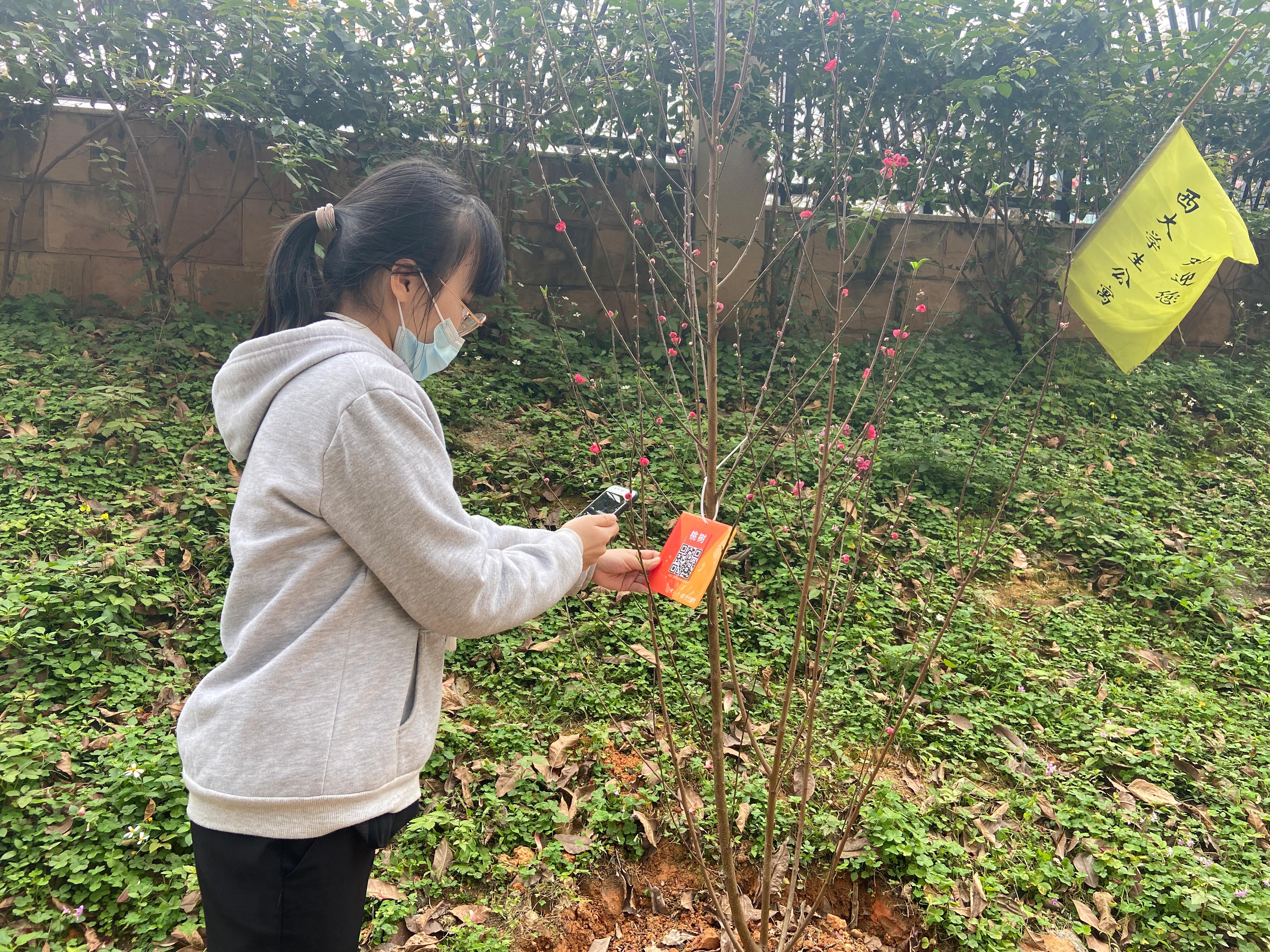 后勤管理处党支部支委、学生公寓老师、丹田物业工作人员和同学们一起给自己栽种的桃树苗挂上领养的专属二维码牌子,记录下这份栽种的喜悦和爱。