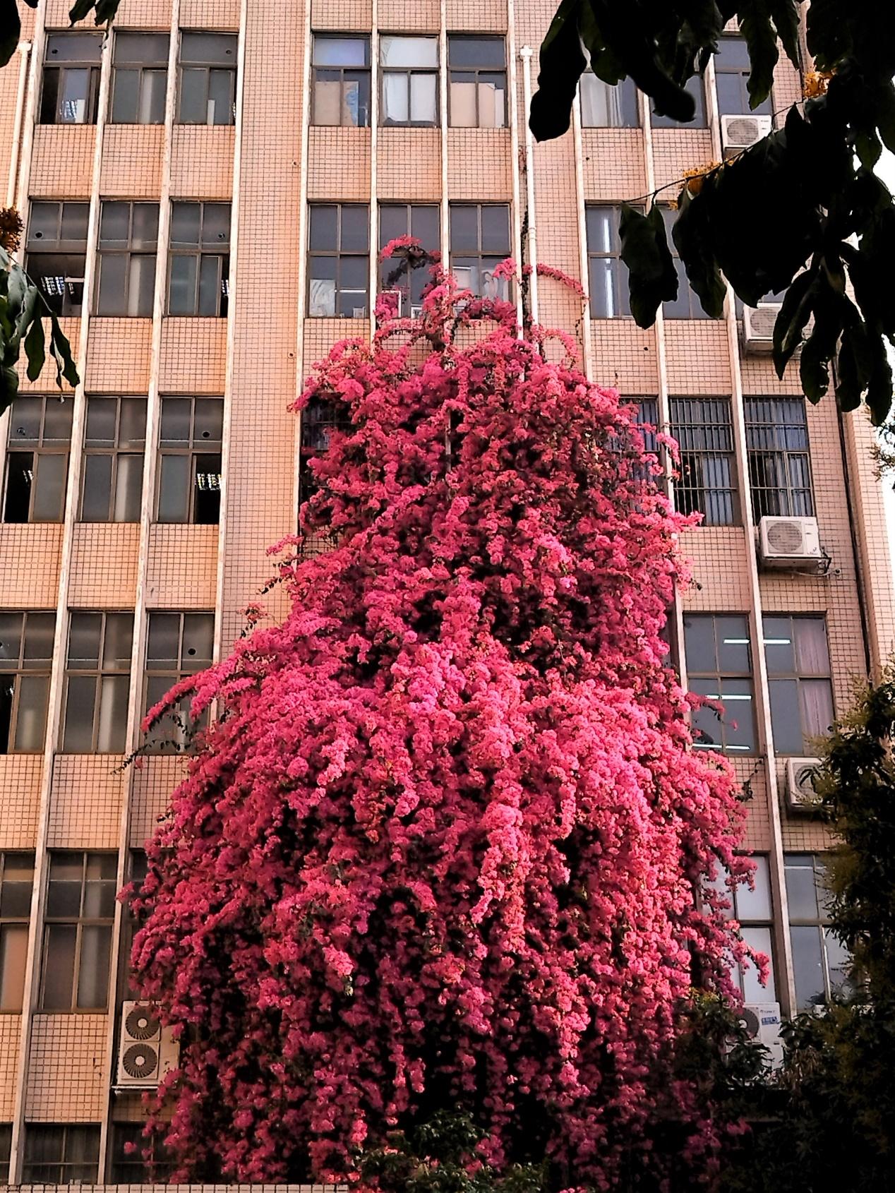 三角梅从计算机与电子信息学院的窗“探出头”,拍摄地点:四教