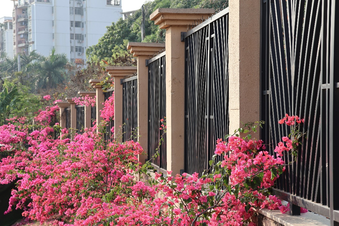 其中,三角梅景观尤为独特。除在学校南侧门、崇左桥、计算机与电子信息学院,研究生院的“三角梅瀑布”还一度被新华网报道,入选《航拍中国》。