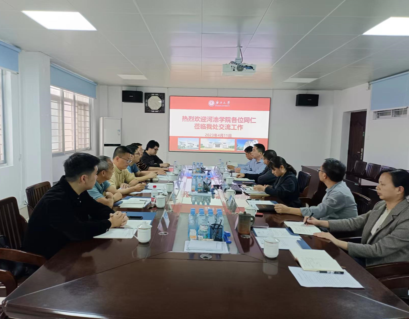 河池学院后勤管理处(基建处)蓝凛副处长、唐朝君副处长,我校后勤基建处严壮锋副处长及双方有关工作人员参加交流座谈。