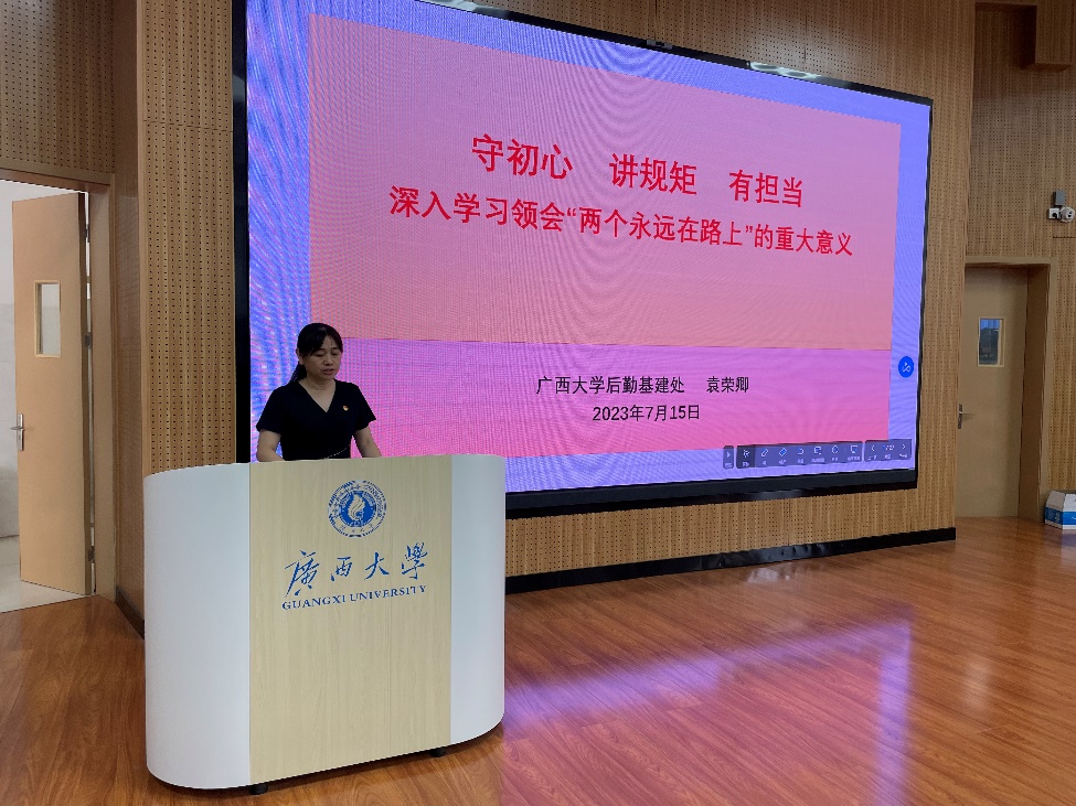 各分管领导就分管领域的暑假工作任务作了具体安排部署。后勤基建处副书记、纪委书记、副处长袁荣卿以《守初心,讲规矩,有担当——深入学习领会“两个永远在路上”的重大意义》为主题讲授专题党课并对全处人员作党风廉政警示教育。袁荣卿从学习贯彻习近平新时代中国特色社会主义思想主题教育为切入点,引导全体人员学习领会习近平总书记关于“两个永远在路上”重大意义,对违反中央八项规定精神、违反教师职业行为十项准则等典型案例进行通报和剖析,引导全体教职工以案为鉴、以案明纪,做到警钟长鸣。