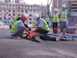 在应急演练环节,模拟现场安全交底后施工现场靠近钢筋加工场通道处一名工人将烟头乱扔引燃废料发生火灾,火势燃烧引发浓烟,致附近另一名工人吸入浓烟陷入昏迷,现场巡查人员发现火情立即向应急救援组汇报并组织开展灭火、救援演练,借此模拟施工现场突发火灾应急处理场景。消防应急救援结束后,校医院梁日成副院长以严谨的态度和生动的讲解,向参与人员详细阐述了应急救护的基本知识和初级救护技能,重点介绍了心肺复苏术(CPR)的正确操作流程,参与人员深刻认识到应急救护在日常生活和工作中的重要性,并了解了面对突发情况时如何迅速做出正确判断和应对措施。