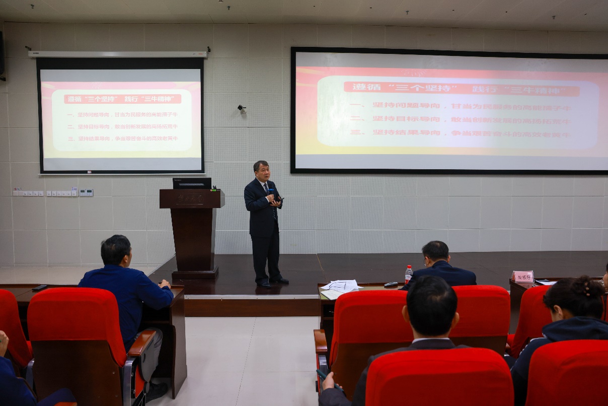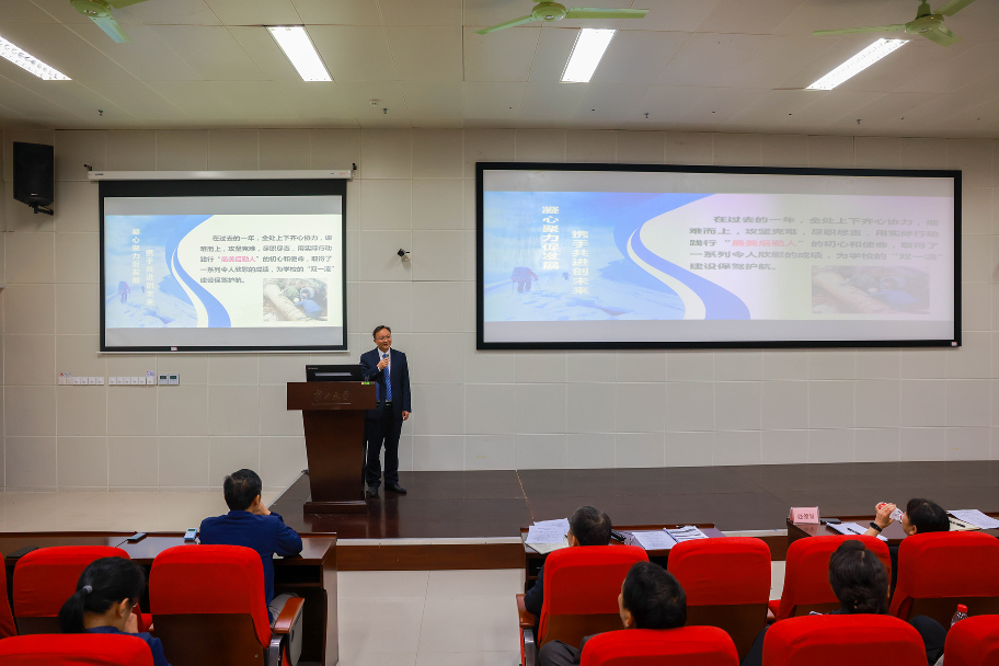黄必春对全体教职员工过去一年取得的成绩表示肯定,同时也分析指出部门管理目前存在的问题和下一步努力方向,对每一位教职员工提出殷切期望,希望每位教职员工遵循“三个坚持”,践行“三牛”精神:一是坚持问题导向,甘当为民服务的高能孺子牛;二是坚持目标导向,敢当创新发展的高扬拓荒牛;三是坚持结果导向,争当艰苦奋斗的高效老黄牛。要继续保持真抓实干、敢拼敢闯的势头,不断提升改革创新能力,进一步增强工作责任心,积极主动解决师生“急难愁盼怨”问题,以久久为功的定力和韧劲推动后勤服务保障和校园基本建设工作高质量发展,全面助力学校“双一流”建设工作。(文字作者:叶亮,图片作者:潘悦凝)