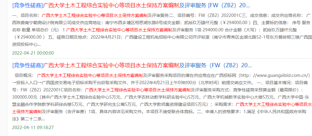 6. 水土保持方案编制及评审服务采购共2次。在广西招标网www.guangxibid.com.cn发布有关公告,以下图片截自广西招标网。