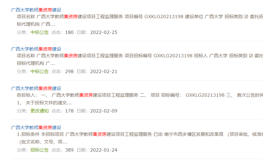 4. 监理招标共4次。在中国招标投标公共服务平台(www.cebpubservice.com)、广西壮族自治区招标投标公共服务平台(ztb.gxi.gov.cn)、广西科联招标中心有限公司网(http://www.gxkl.com)发布有关公告,以下图片截自广西科联招标中心有限公司网站。