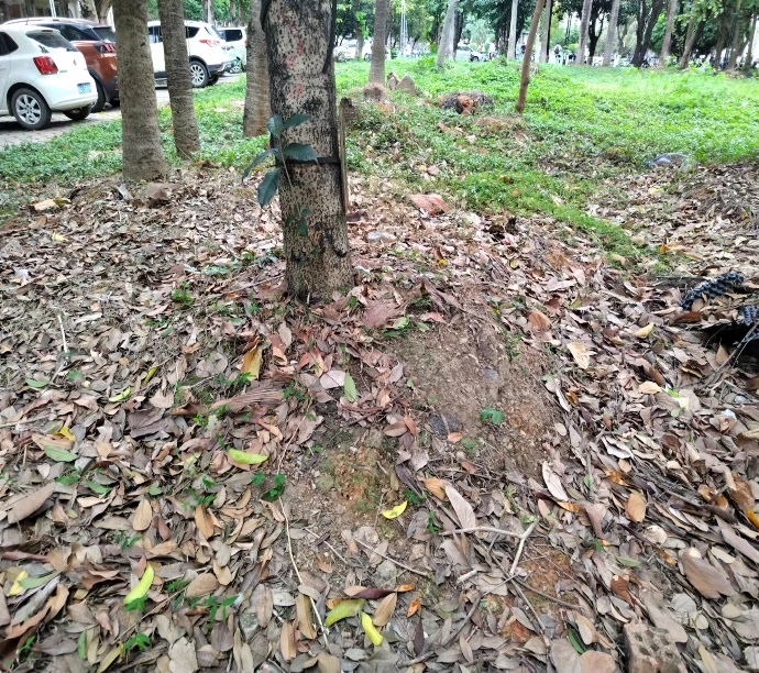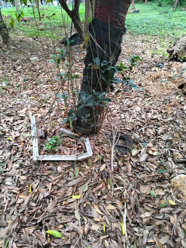 6.另外,对位于假植地中另一棵桂花树(胸径约30cm,高约6-7m,全冠)做好断根、土团包扎、土团回填等工作,作为备用桂花树。6个月后如第一次所移植的桂花树枯萎,或长势不良,景观不佳,则移植已断根的备用桂花树替换,见附图4、5;
